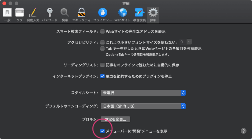 Safari > 環境設定 > 「詳細」タブ > 「メニューバーに"開発"メニューを表示」をONにします。