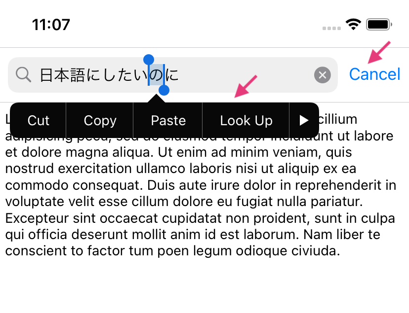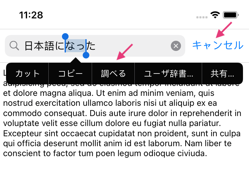 アプリをリリースすると、すべて日本語で表示されるかと思いきや、部分的に英語で表示される場合があります。 例えば、UISearchBarのキャンセルボタンが「Cancel」と表示されたり、UITextView等でテキストを選択したときに出るツールチップのボタンが英語で表示されたりします。