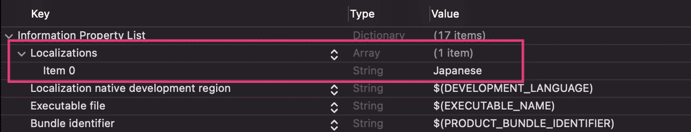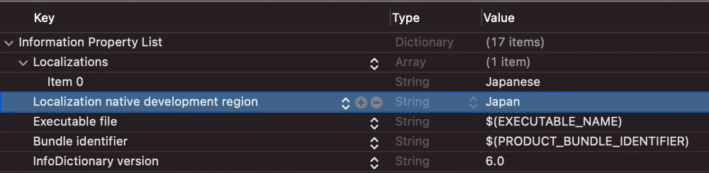 Info.plistで、「Localization native development region」の項目を「Japan」に設定します。