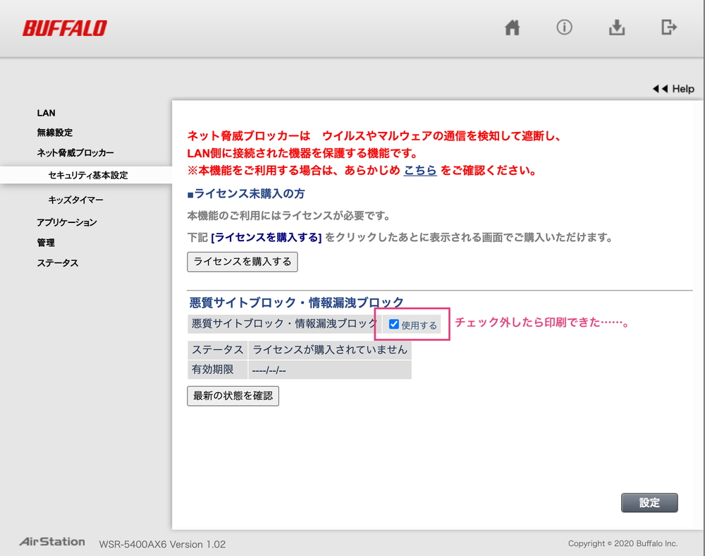 Buffaloのルータにある「ネット脅威ブロッカー」という機能によって、MacやiPadからプリンターへの通信がブロックされてしまいました。ネット脅威ブロッカーはライセンス購入の必要な有料機能ですが、購入していなくても「使用する」にチェックが入っていると、プリンターへの通信がブロックされてしまうようです。私はおそらく、ライセンスを購入しないと思います。