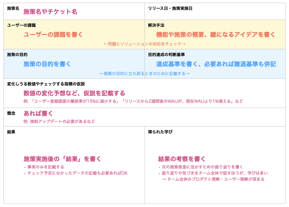 スタートアップ初期のプロダクトにしても、すでにPMFしているプロダクトにしても「施策をやりっぱなしにしない」ということは大切なことです。 以下の図は、施策をやりっぱなしにしないために、個人的に作っていた表です。これを作ったあと、開発チーム内でも共有したり、いくつかの案件で事例紹介をすることがありました。