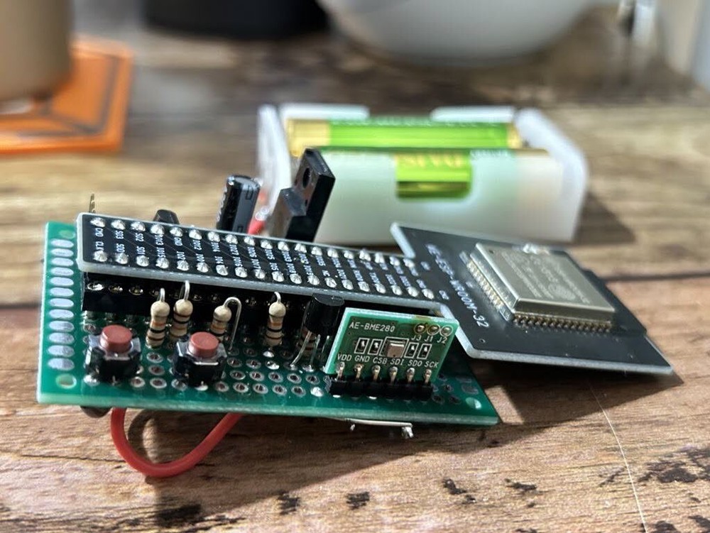 ケースが出来上がったら屋外に設置しようと思っていたのですが、かなわなくなってしまいました。 BME280モジュールを基板にがっちりはんだ付けしてしまったので、この実装では、ESP32も外気に露出することになってしまいます。 屋外だと、霜や結露、雨の心配もあるので、ESP32の方はドライケースに入れるなどの工夫をしたいところです……。 もし次に屋外で使うセンサー系のものを作る際は、センサーは基板から離すように実装したいです。