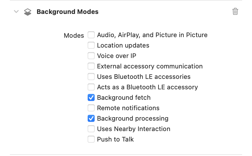 まず、Background Taskを使う準備をします。Capabilitiesに、Background Modeを追加します。そして、BGAppRefreshTaskを使う場合は「Background fetch」を、BGProcessingTaskを使う場合は「Background processing」にチェックを入れます。