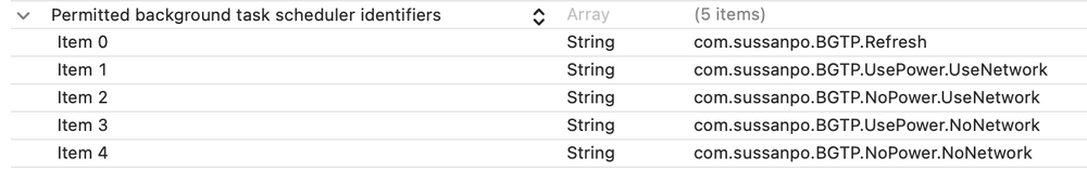 次に、Info.plistにBackground Taskのidentifierを追記します。「Permitted background task scheduler identifiers」(BGTaskSchedulerPermittedIdentifiersと入力すると出現)に、identifierを追記ます。StringのArrayになっているので複数追記することができます。