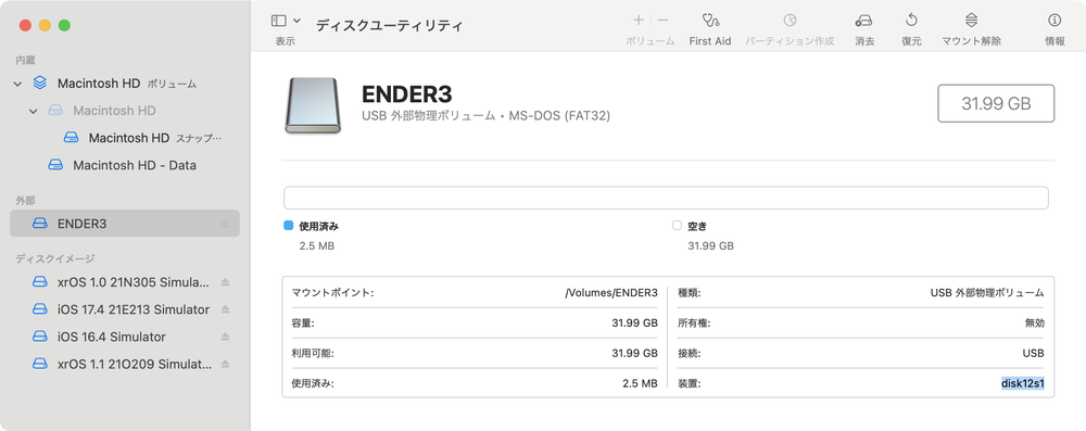 1: DOS_FAT_32 ENDER3 32.0 GB disk12s1