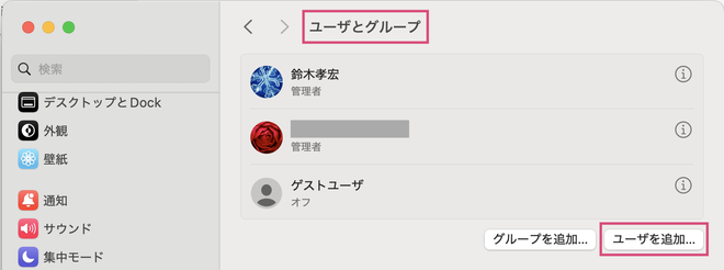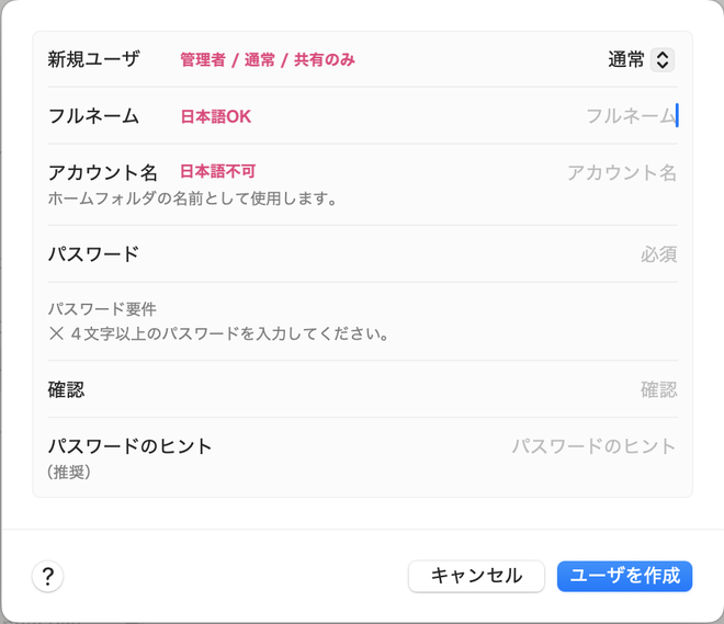 ユーザーの作り方は、至って簡単です。管理者のアカウントでログインし、システム環境設定から、ユーザーを追加します。 フルネームの部分は日本語の名前でOK。アカウント名は、日本語にできず、使用不可の文字は入らないようになっています。