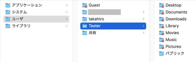 パスワードの入力も済ませて完了すると、追加したユーザーのホームフォルダ /Users/アカウント名 が作成されます。