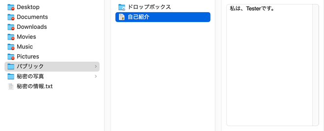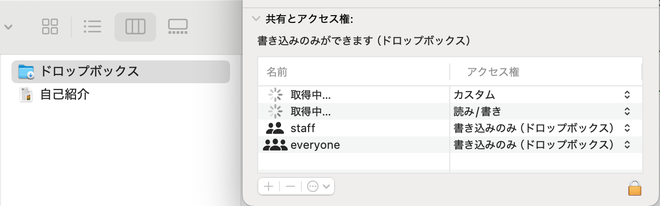 それでも、ファイルを他のユーザーに見せたいとき、あるいは個別に渡したいときがあります。そういうときは、/Users/アカウント名/パブリックや、その下のドロップボックスを使います。