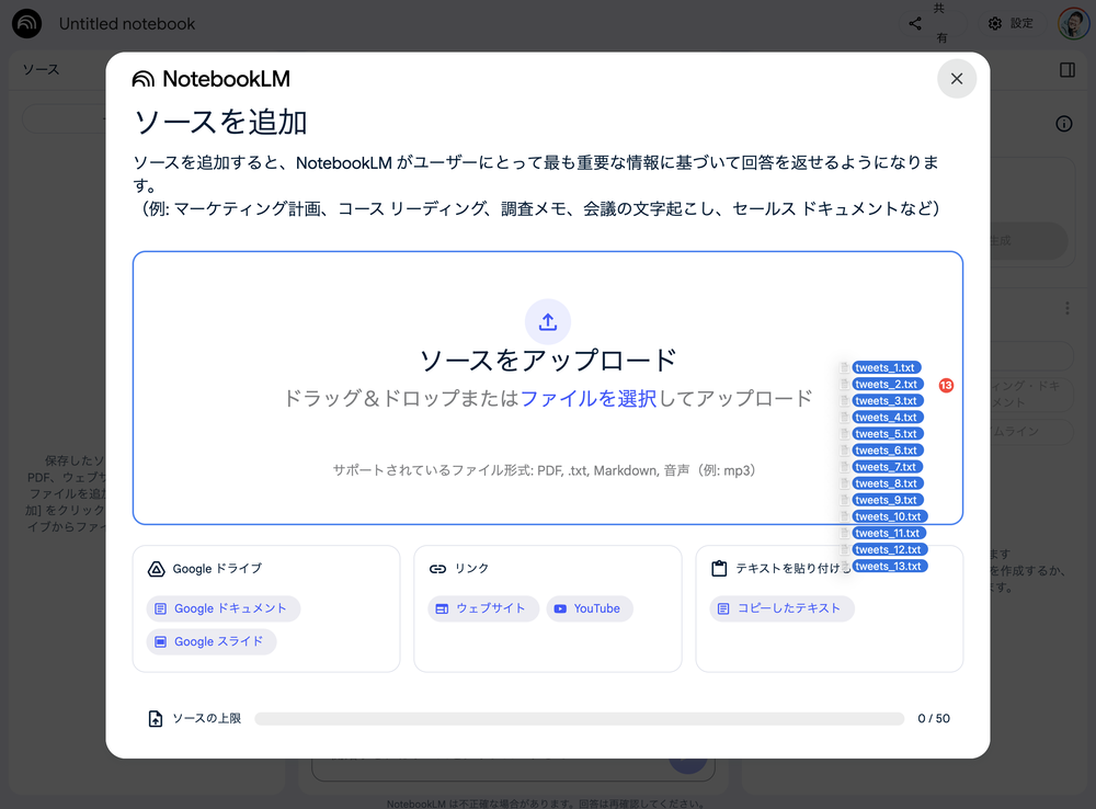 500ツイートずつが適切かはわかりません。1000ツイートずつでもNotebookLMは読んでくれました。 ただし、7000件弱(10MBのテキスト)だと、NotebookLMが読み込むのに失敗したので、読み込める程度に小さくする必要があります。 公式ドキュメントによると「ソース1件につき50万語」とのことなので、やはり1ファイルあたりのツイート量は小さくした方が良さそうです。 もしかすると、JSONのまま出力するのではなく、ツイート本文だけ出力するのでも良さそうです。