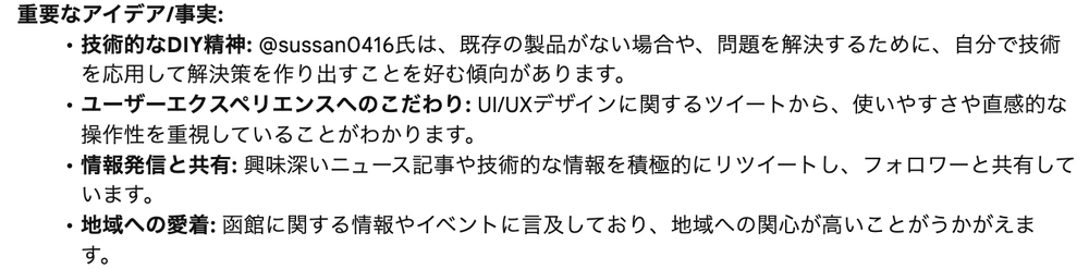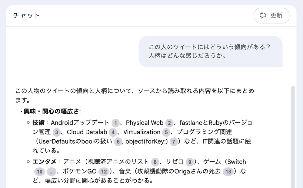 ブリーフィングドキュメントを生成すると、登録したドキュメントの概要を得ることができます。 ツイートを通して、自分という人間の概要を手軽に知ることができます。
