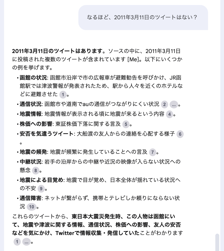 ところで、NotebookLMにしても、ChatGPTのプロジェクト機能にしても、ツイートを細かく読んでいる感じはありません。 ドキュメントを一言一句見ているというよりは、全体の傾向を認識している、という感じがあります。 このため、確実にあるはずの文言を探させても、存在しないと言われることがあります。